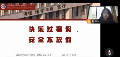 张雨薇老师向大家传达了学校关于寒假的通知以及假期的安全注意事项,从出行安全、消防安全、防范电信诈骗安全、燃放烟花爆竹安全等方面具体进行强调,提醒同学们时刻将人身安全放在第一位,持续警惕电信诈骗,未经核实不向陌生平台、陌生人转账,对于涉及转账汇款之类的QQ、微信消息等一定要直接打电话确认。