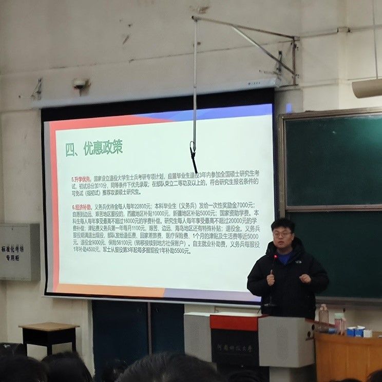 随后,刘老师依照国家政策,有序的讲解了征兵入伍的时间、报名方式和相关的待遇。他重点强调了学业保障和经济补助,应征入伍服义务兵役前正在高校就读的学生(含新生),服役期间按国家有关规定保留学籍或入学资格,退役后2年内允许复学或入学。退役大学生士兵复学,经学校同意并履行相关手续,可放宽专业限制转入本校其他专业学习。在部队荣立二等功及以上的退役士兵,符合研究生报名条件的可免初试攻读硕士研究生。对应征入伍服义务兵役、招收为军士、退役后复学或入学的高等学校学生实行学费补偿、国家助学贷款代偿、学费减免。此外,还有义务兵家庭优待金、大学生入伍一次性奖励金、艰苦地区服役奖励等多项经济优待。