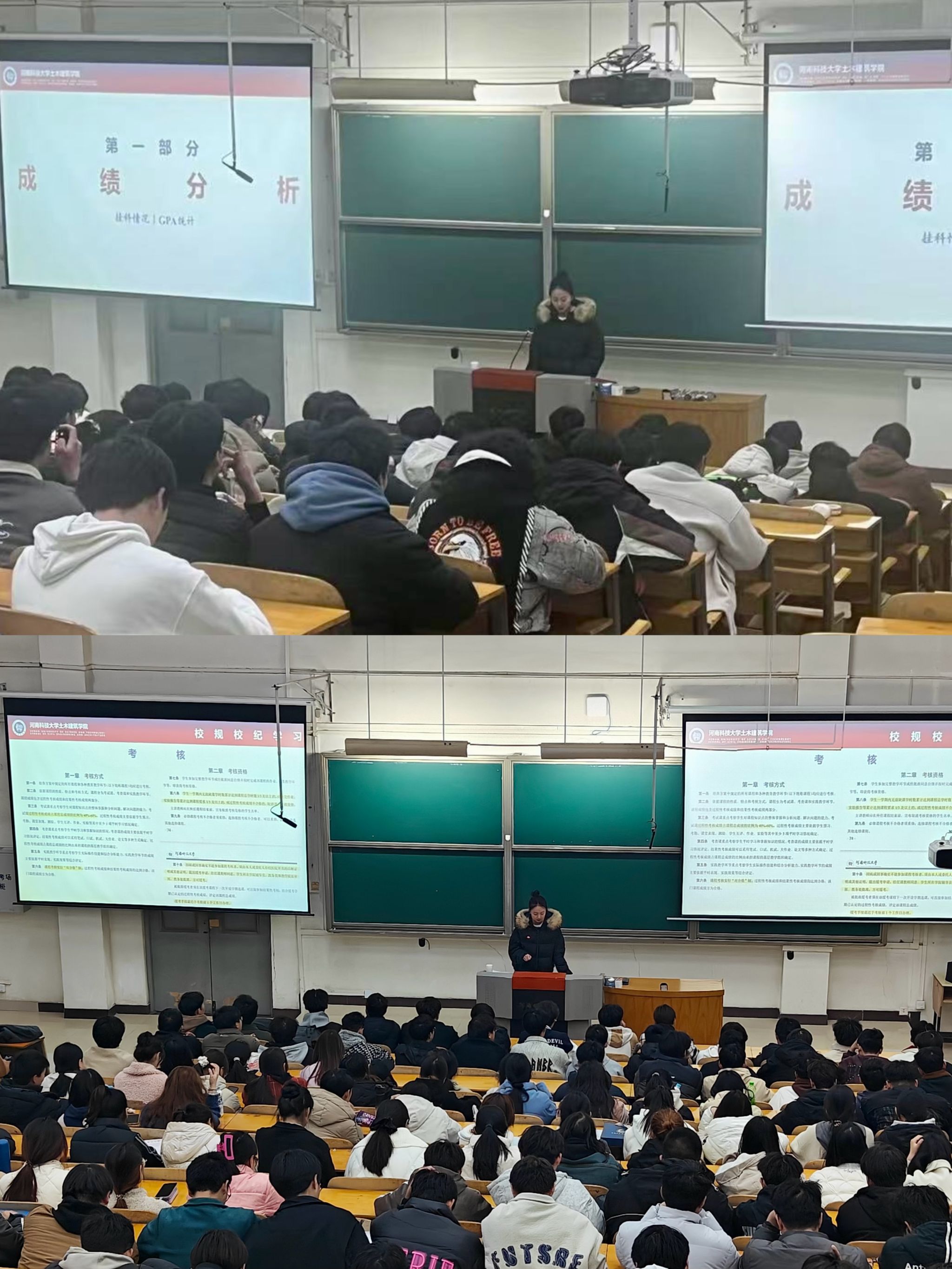 深入一线课堂,与学生共同听课,了解教学情况,督促学生珍惜时光,专注学习。关注补考考场,维护考风考纪,确保补考考场秩序井然。分析期末成绩,为中上游学生提供个性化学业规划与就业指导,助其找准自身定位,稳扎稳打,评选出“匠心卓越之星”“筑梦飞跃之星”,激励表彰树榜样。召开主题班会,如课程辅导会、成绩分析会、学业规划会、就业促进会等,引导学生明确学习目标、激发学习动力,为学生顺利步入职业生涯奠定坚实基础。