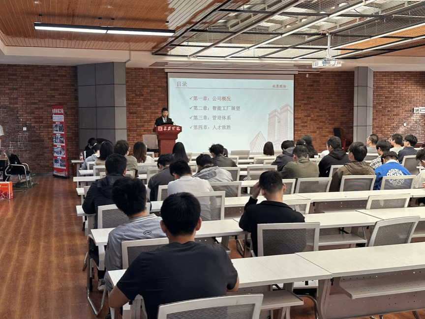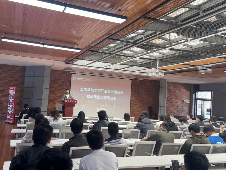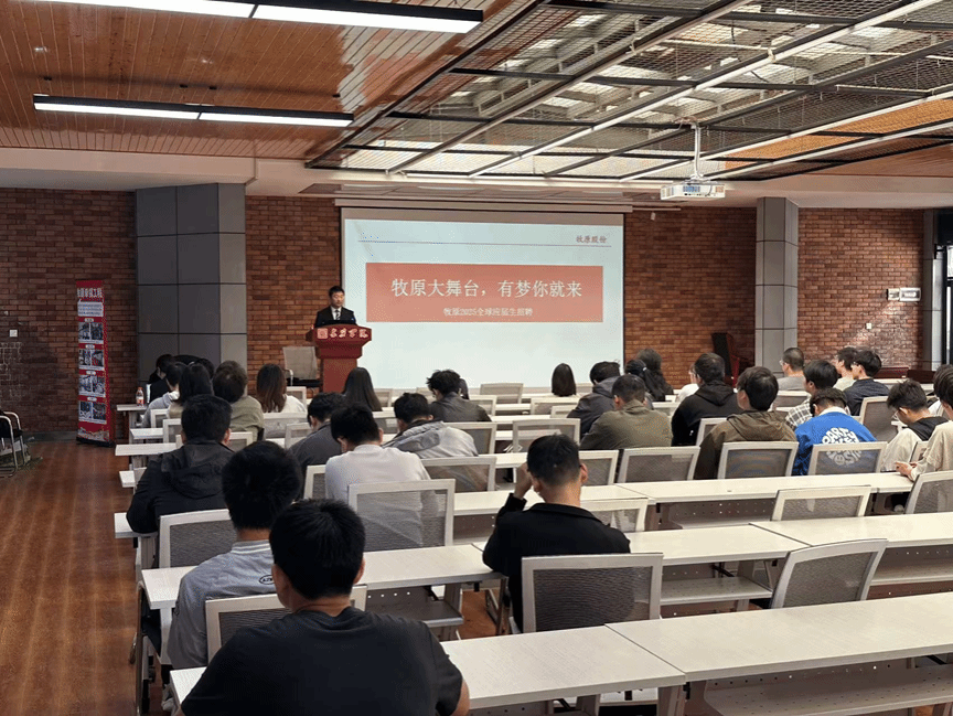 宣讲会现场,牧原食品股份有限公司招聘负责人从公司概况、智能工厂展望、管培体系、人才致胜等4个方面为毕业生进行了详细的讲解。他表示牧原是一个成就梦想的大舞台,有梦你就来,热烈欢迎大家的加入。
