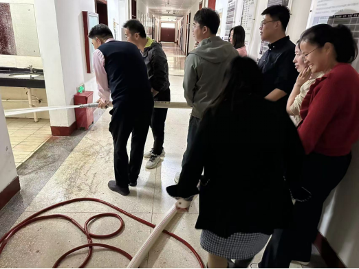 消防安全员何杰首先讲解了消防水龙头的安装和使用步骤,然后大家对大小两类消防水龙的安装和喷淋操作进行了试用,各位老师积极参与,场面紧张而有序。