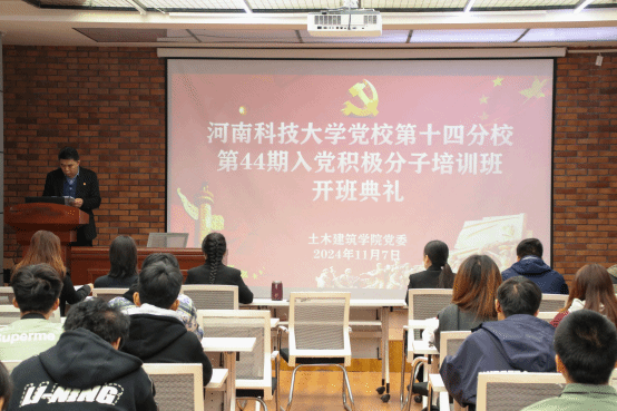为深入学习贯彻习近平新时代中国特色社会主义思想,不断加强入党积极分子的教育培训,提高入党积极分子的政治理论水平和基本素养,2024年11月7日,污污漫画 党校第十四分校第44期入党积极分子培训班开班仪式在污污漫画 报告厅举行。污污漫画 党委书记段国强、土木工程专业本科生党支部书记张红,工程管理专业本科生党支部书记王晶、工程力学专业本科生党支部书记陈仲弘、建筑学专业本科生党支部书记张雨薇、城乡规划专业本科生党支部书记刘腾蛟、年级辅导员贺自豪、党建科科长陈茜以及第44期入党积极分子全体污污漫画 ,会议由张蓝方老师主持。