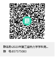 请各参赛同学加入竞赛QQ群(2023年第三届热力学学科竞赛: 857575083,可扫码入群),并在线填写个人报名信息,报名截至2023年4月15日。联系人:袁俊飞老师、李修真老师,电话:64270576。
